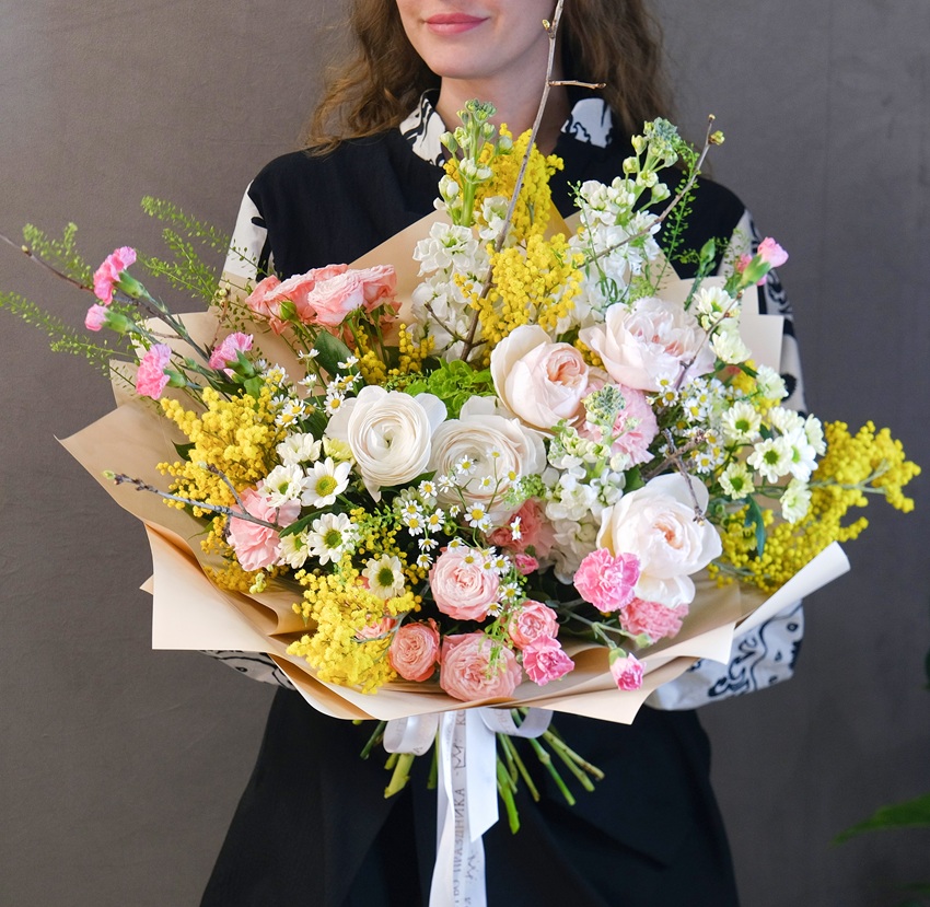 В этом букете встретились главные символы весны: трогательная пушистая мимоза, словно сотканная из солнечных зайчиков, нежные ранункулюсы, похожие на маленькие пионы, и королева цветов — роза.