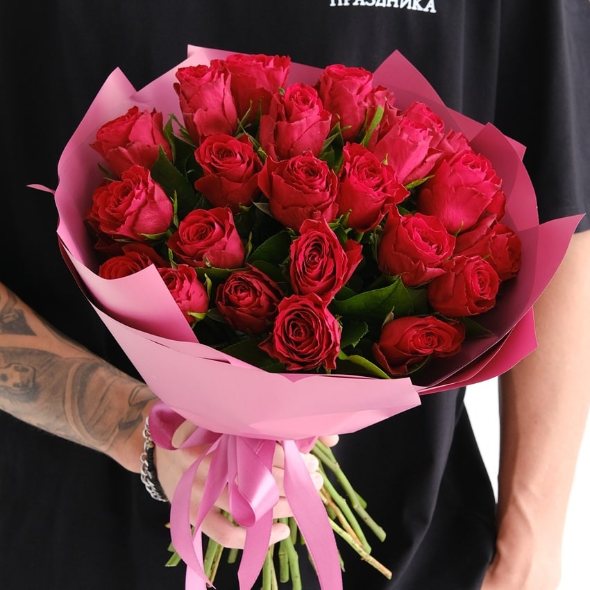 25 красных роз 40 см с зеленью в букете "Саванна"