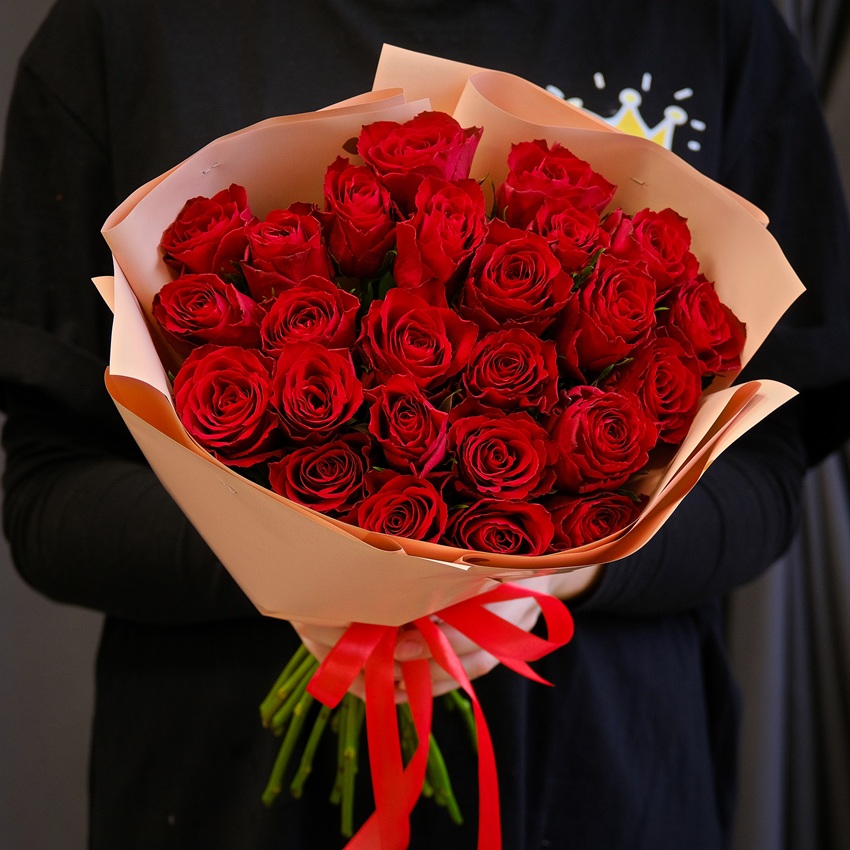 Красные розы, 25 штучек в круглой бежевой матовой пленке