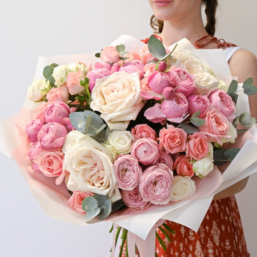 Этот букет - как признание в тёплых чувствах. Пудрово-розовые пионы, кремовые и насыщенные розы, белоснежные акценты и эвкалипт создают нежную, чувственную композицию.
