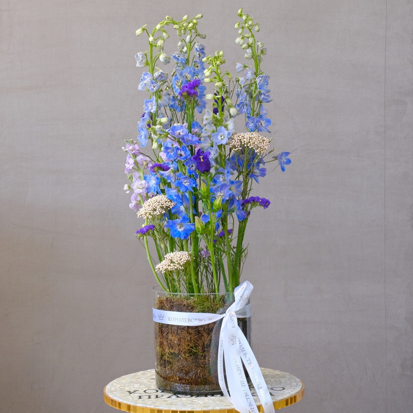 Там, где вода встречается с небом, рождаются самые красивые сны. Этот букет — словно кадр из подводного путешествия: высокие свечи дельфиниума уходят вглубь, как лучи света сквозь толщу воды, а нежные колокольчики рассыпаются звонкой пеной по поверхности. Букет в вазе — готовый подарок для тех, кто слышит музыку прибоя даже в городской суете и хранит в душе что-то вечно синее, как океан.