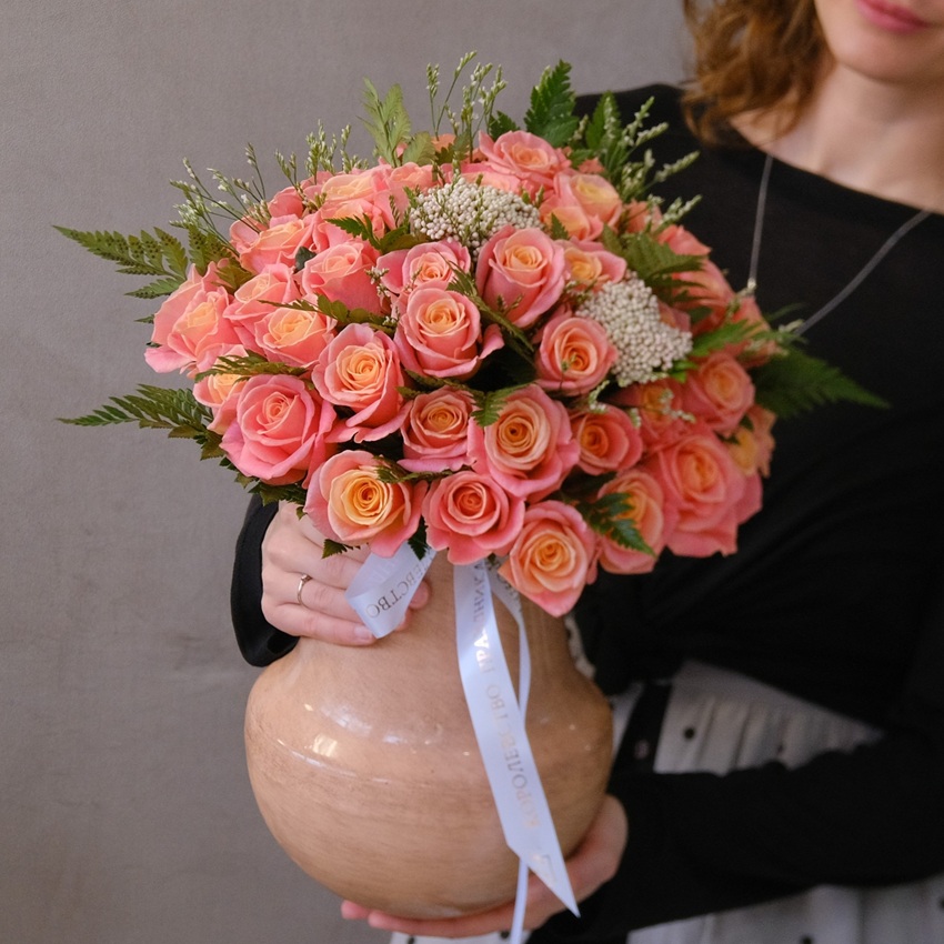 Букет в вазе. Волшебные персиковые розы, 59 шт