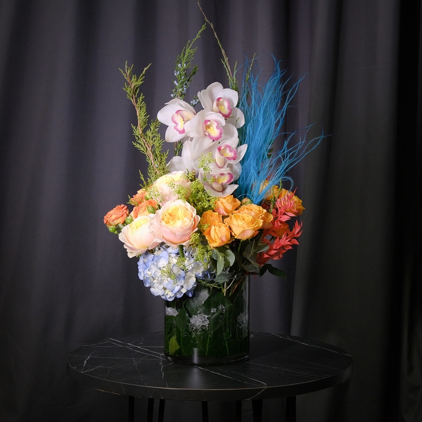 Орхидеи, голубая гортензия и пионовидные розы в стеклянной вазе