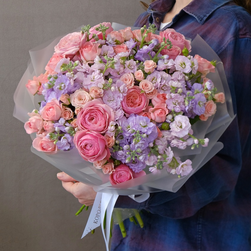 Мы взяли три сорта кустовых роз — чтобы создать розово-сиреневую симфонию. Добавили маттиолу двух оттенков — ради её сумасшедшего аромата. А потом поняли: остановиться невозможно. Так родилось "Сладкое помешательство".