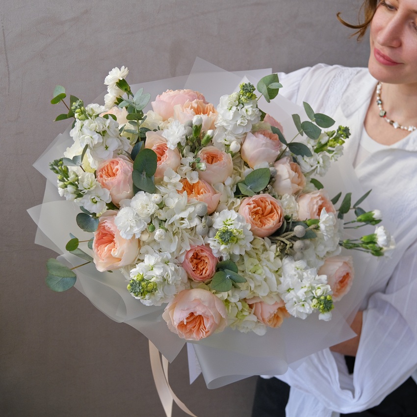 Ароматная маттиола и пионовидные розы Джульетта в букете "Миллион долларов"