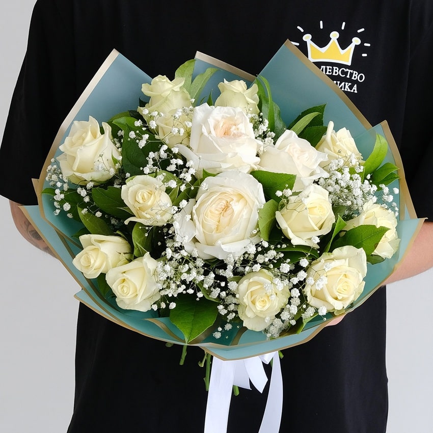 Пышный букет из 15 ароматных белых роз с белыми бусинами гипсофилы и зеленью.