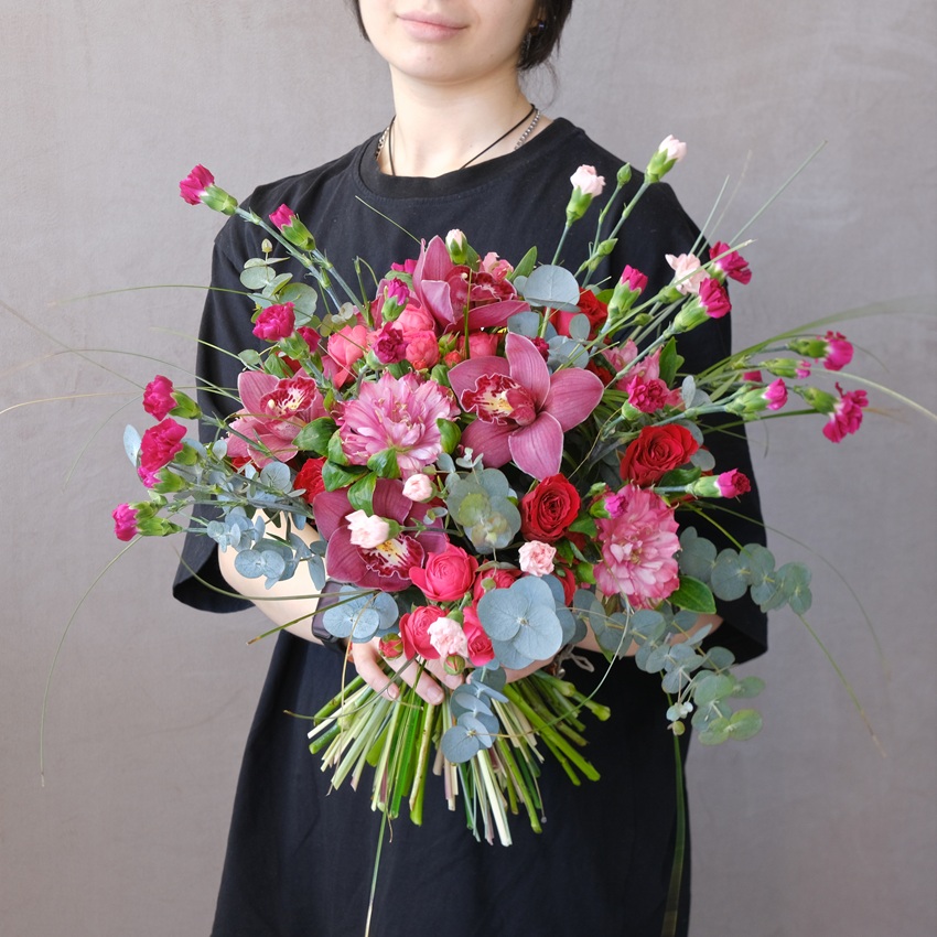 Бордовые орхидеи и альстромерии в садовом букете