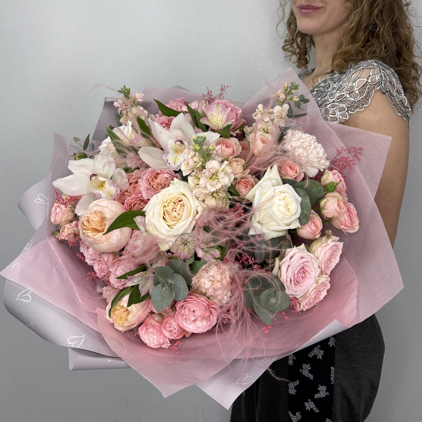 Букет с орхидеями и пионовидными розами "Нежный поцелуй"