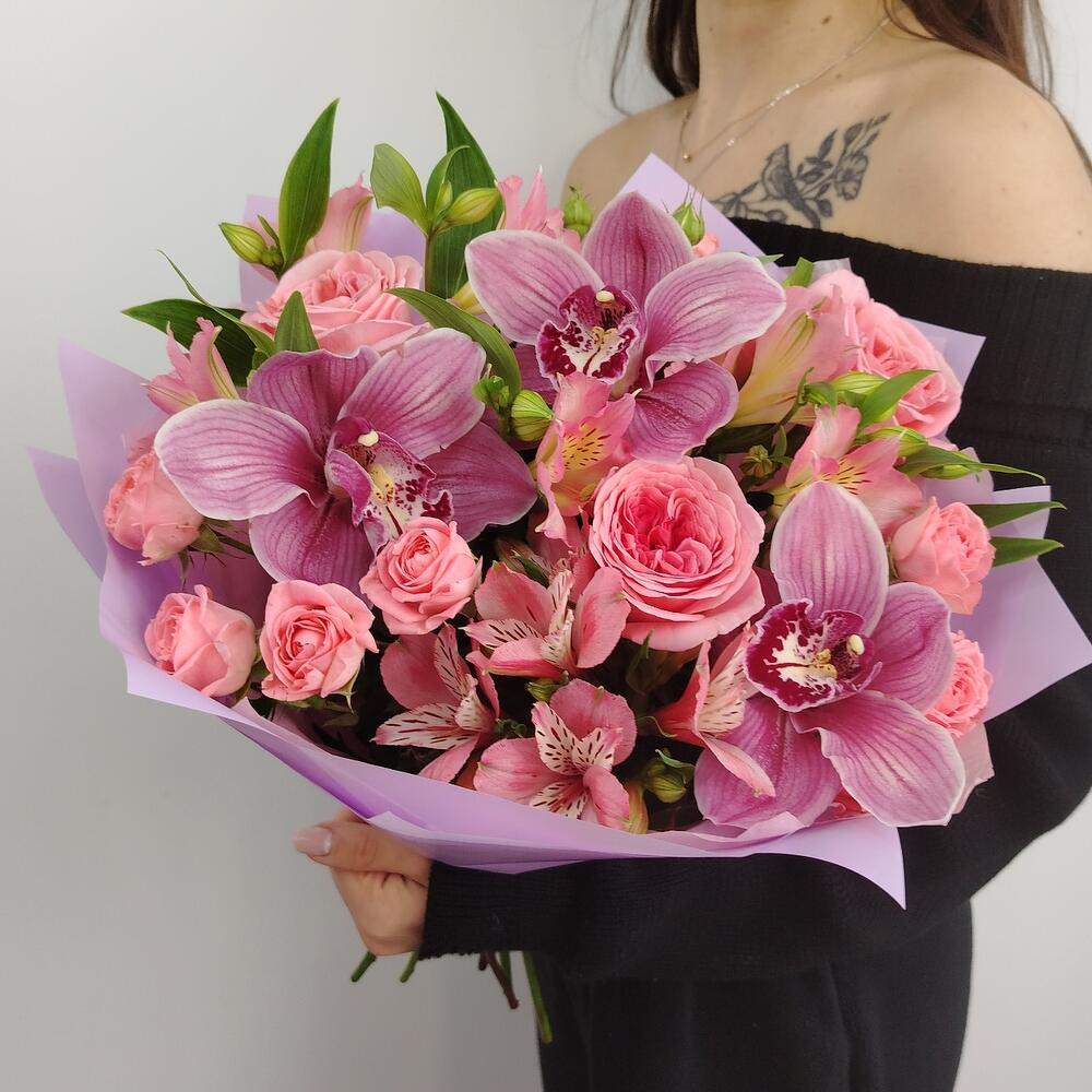 Орхидеи и пионовидные розы в букете "Райские бабочки"