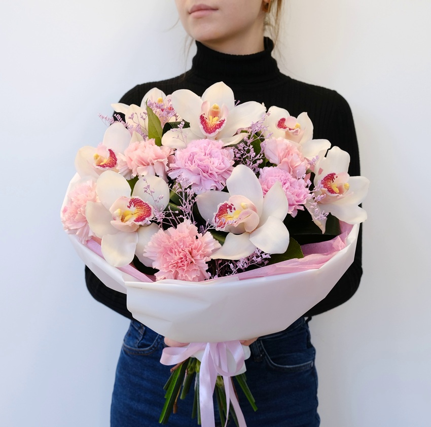 Орхидеи и пушистые гвоздики в букете «Изысканный дуэт»
