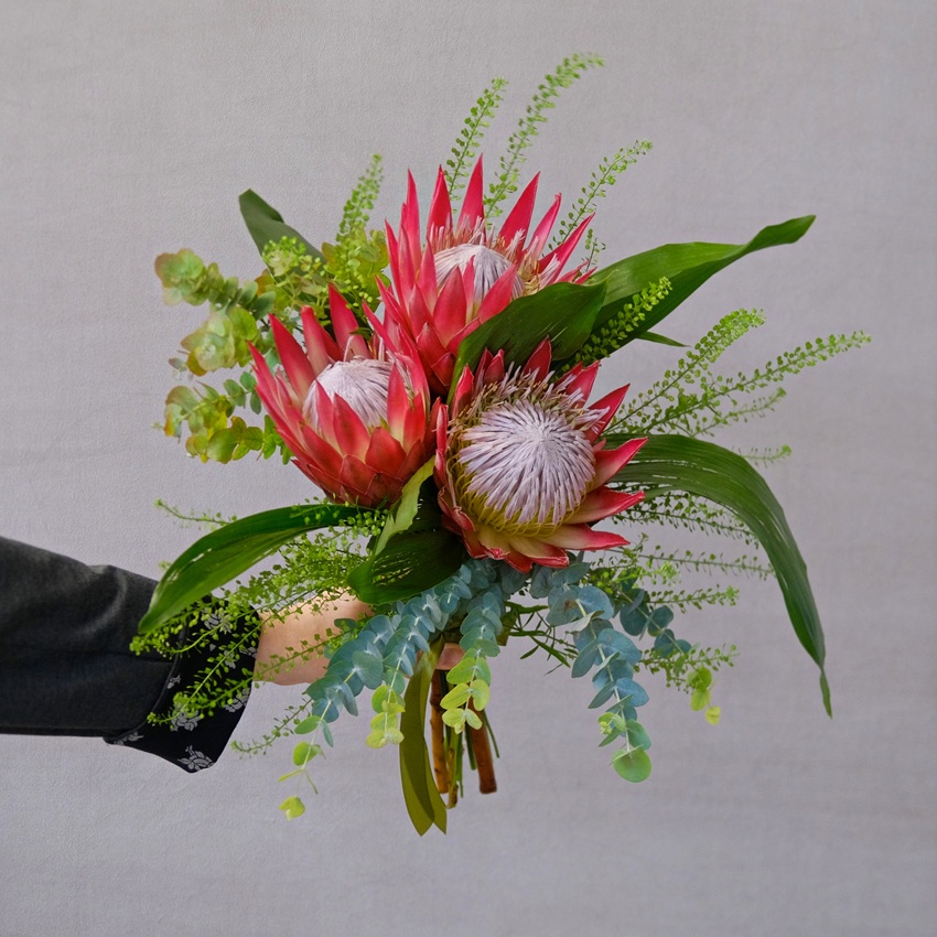 "Королева пустыни" — это букет для тех, кто выбирает характер, а не нежность. В центре — три протеи, экзотические цветы из Южной Африки, похожие на короны или на инопланетные звёзды.