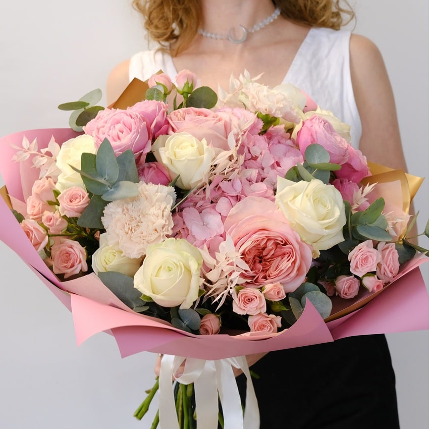 В букете гармонично переплетаются белые и розовые розы, пионовидные розы, гвоздики, гортензии и эвкалипт — каждая деталь продумана до мелочей!