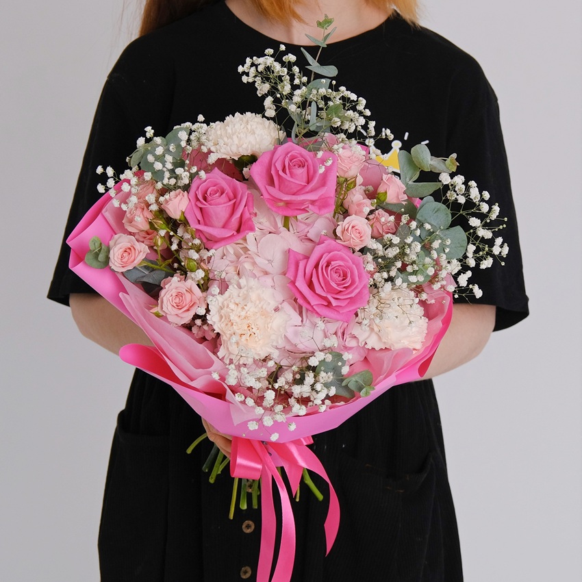 Розовая гортензия и розы в букете "Малиновый бриз"