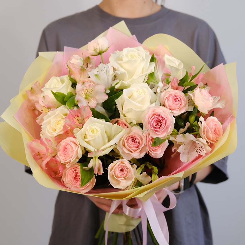 Этот очаровательный букет наполнен нежностью и элегантностью. Сочетание белоснежных роз, нежных розовых кустовых роз и изысканных альстромерий создает неповторимую композицию, которая станет прекрасным подарком для любимой женщины, мамы или подруги.