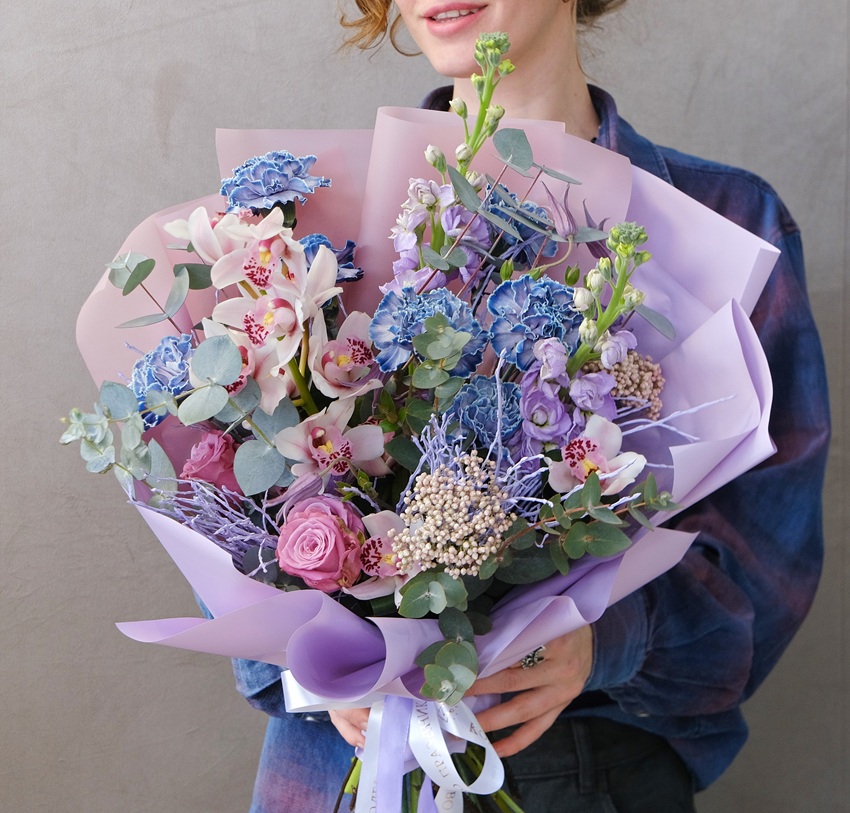 Таинственные мини-орхидеи и нежные сортовые гвоздики в сиреневой дымке. Для романтичных и мечтательных.