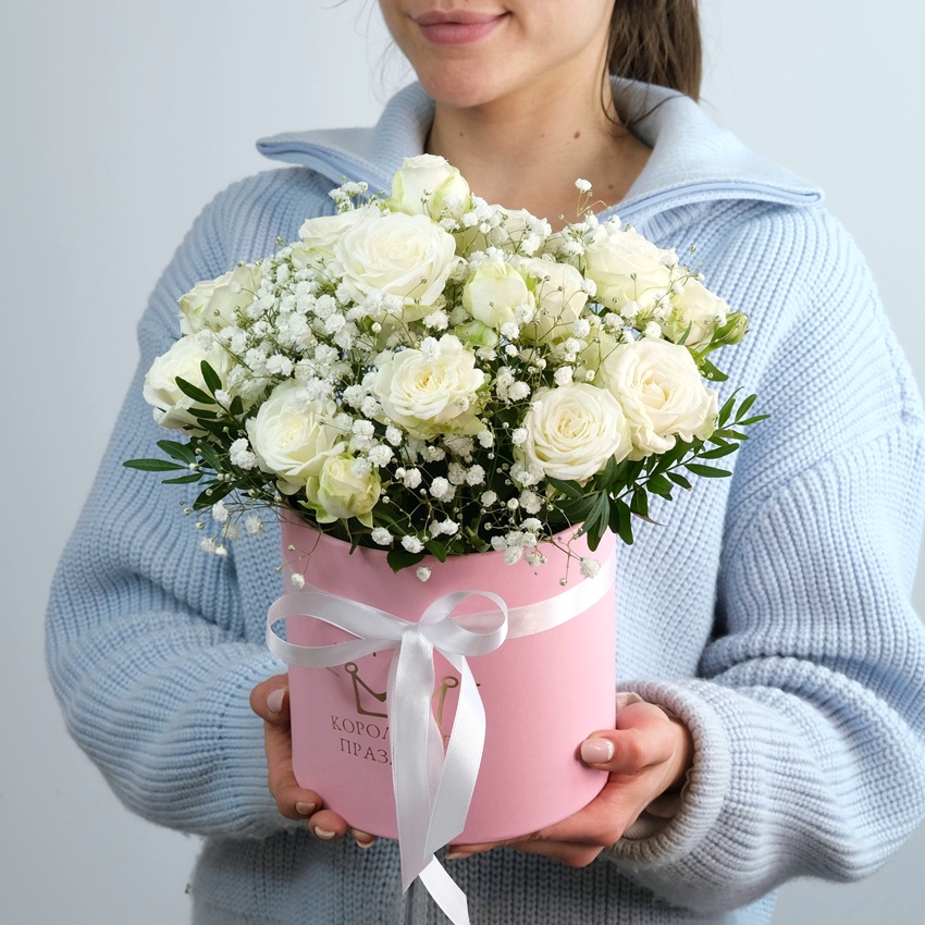 Букет из кустовых роз и белоснежной гипсофилы в стильной коробочке, созданный для тех, кто ценит чистоту, нежность и элегантность деталей. Центром композиции становятся белые кустовые розы – символ чистоты, невинности и вечной любви.