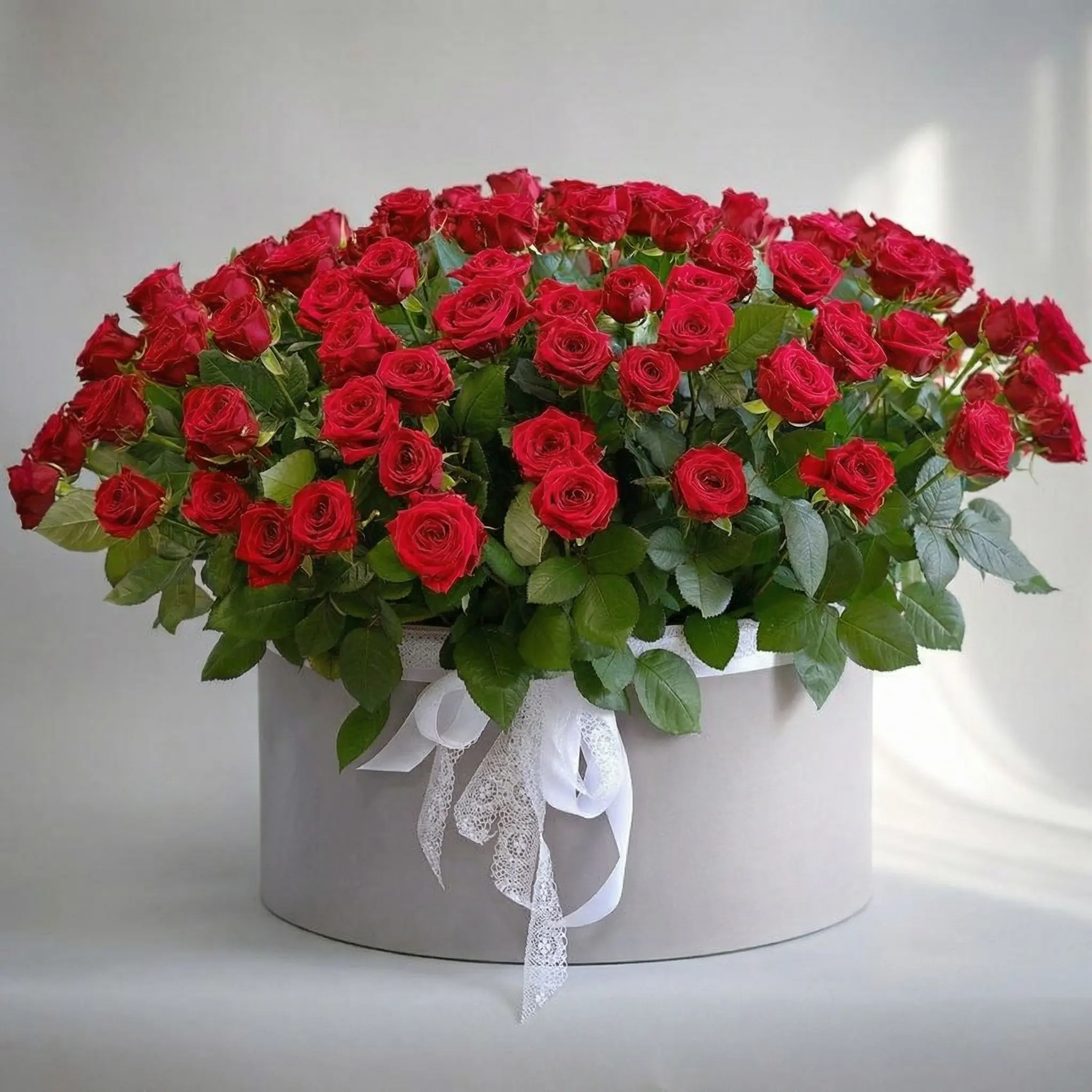 Букет гигант: красные ароматные розы в коробке, 111 штук