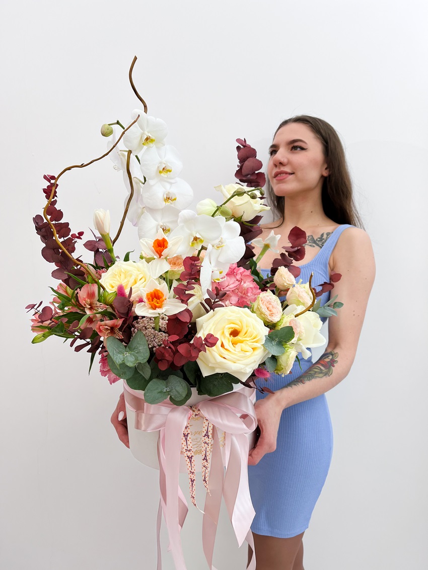 В составе фаленопсис королевский, ароматные пионовидные розы, нарциссы, декоративная зелень и любовь флориста!
