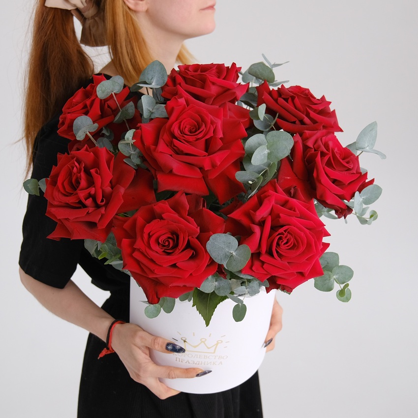 Монобукет из невероятных и ароматных французских роз, собранный в коробке с эвкалиптом.