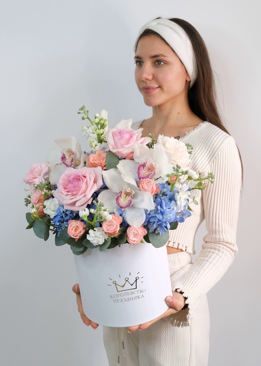 Голубая гортензия, орхидеи и розы в коробке "Мечта принцессы"