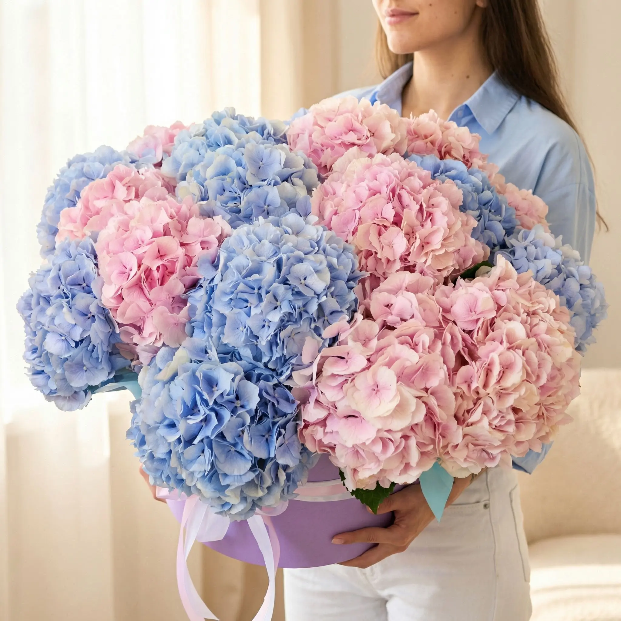 Подарите радость и красоту с букетом из 21 розовой и голубой гортензии.