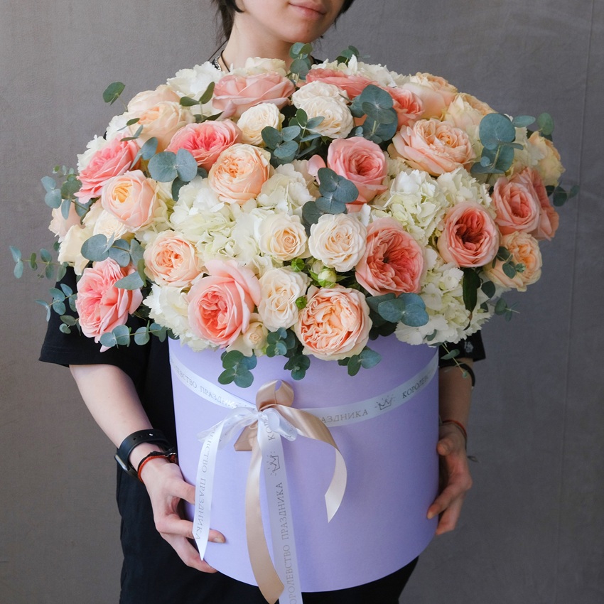 Роскошный букет в коробке из белых гортензий и персиковых роз Джульетта с эвкалиптом.