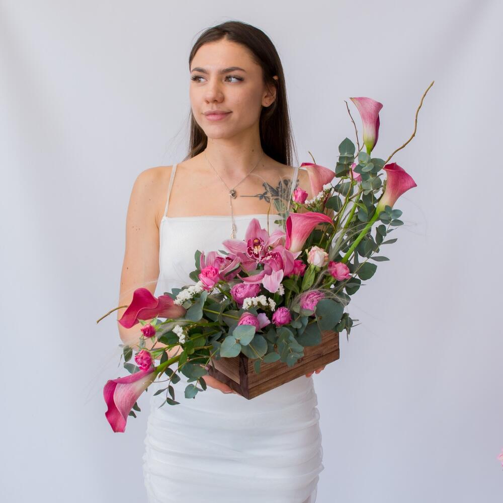 Интерьерная композиция с орхидеями и каллами в деревянном ящике