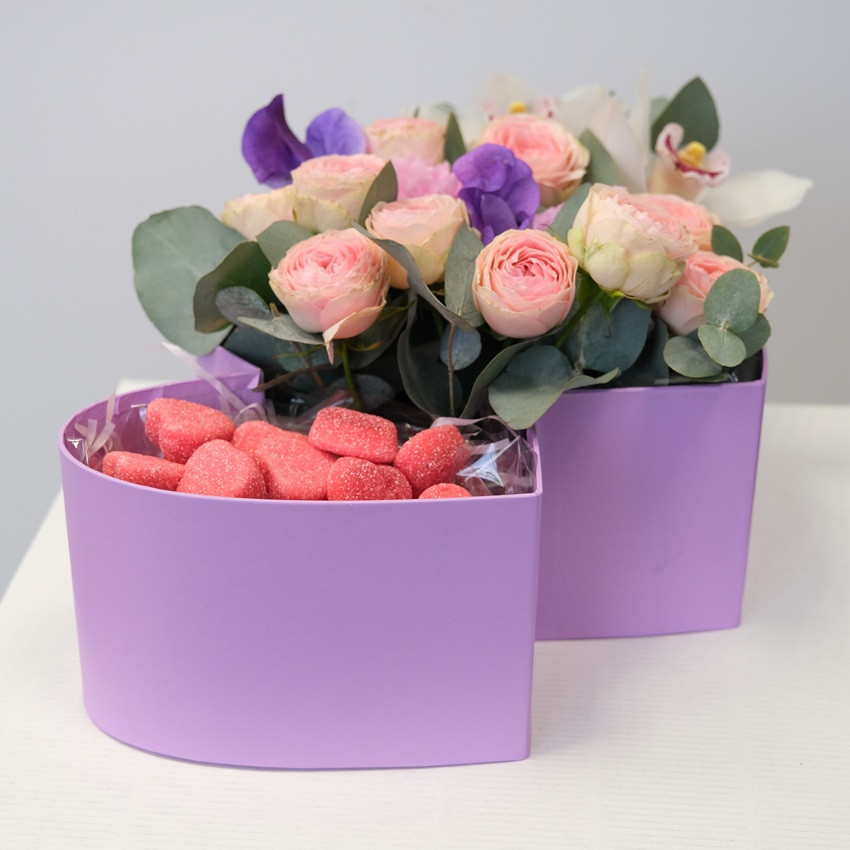 Коробка сердце: мармелад, орхидеи и кустовые розы