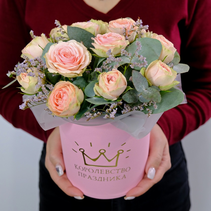 Кустовые розы в коробочке с эвкалиптом "Кэти"