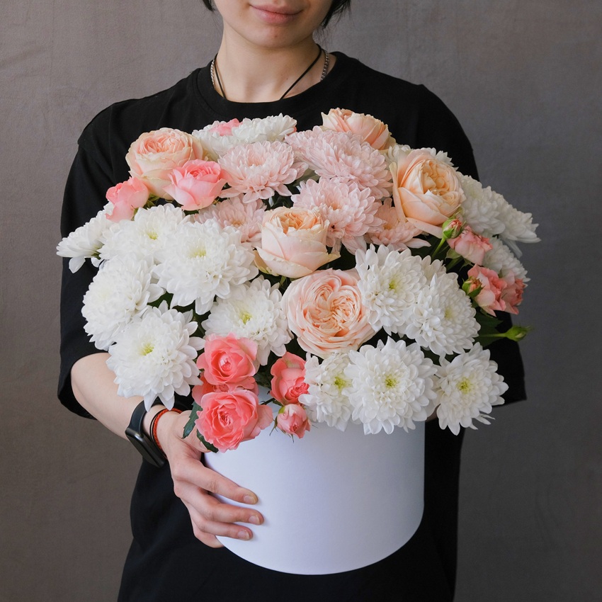 Нежные кустовые хризантемы и пионовидные розы в коробке «Сахарная вата»