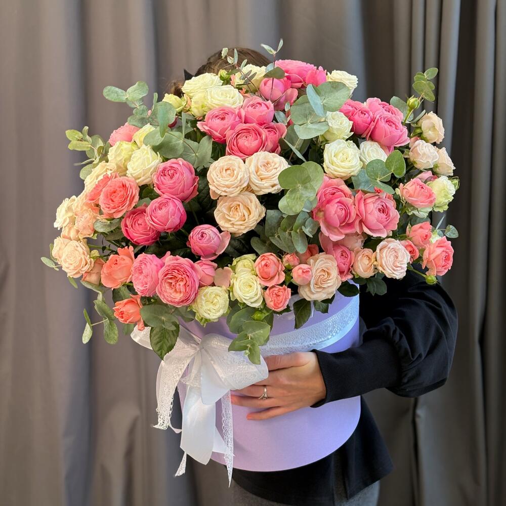 Пионовидные кустовые розы в большой коробке, 25 штучек
