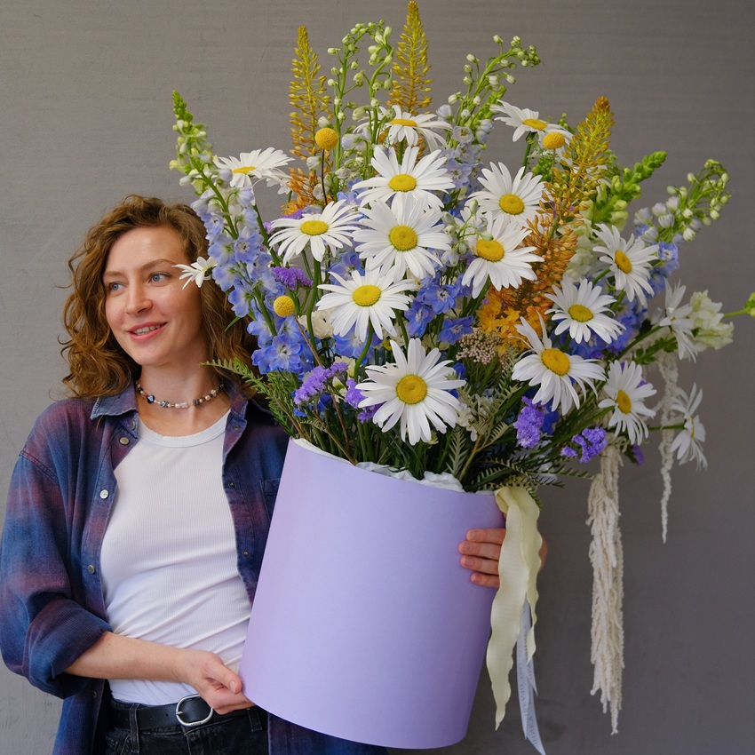 Высокий, строгий дельфиниум уходит вверх, как синее небо над полем, а ромашки рассыпаются белыми звёздами, создавая ощущение лёгкости и простора. Этот букет — для того момента, когда хочется сказать: «Ты — моя вселенная. И у неё нет границ».