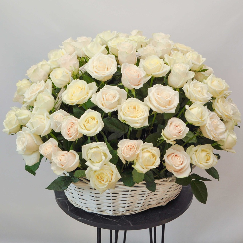 101 роза Россия (белые и ароматные) в корзине