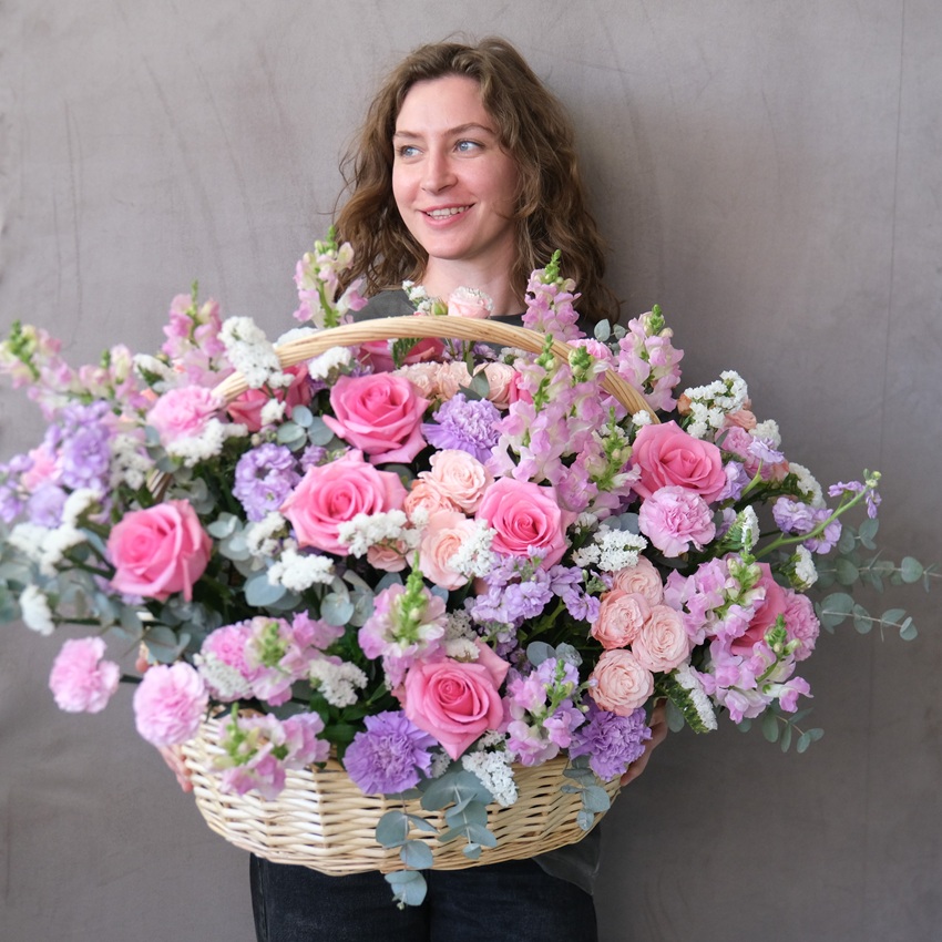 Большая корзина с интересным составом - розы, маттиола, антирринум и диантусы. Для особого случая!