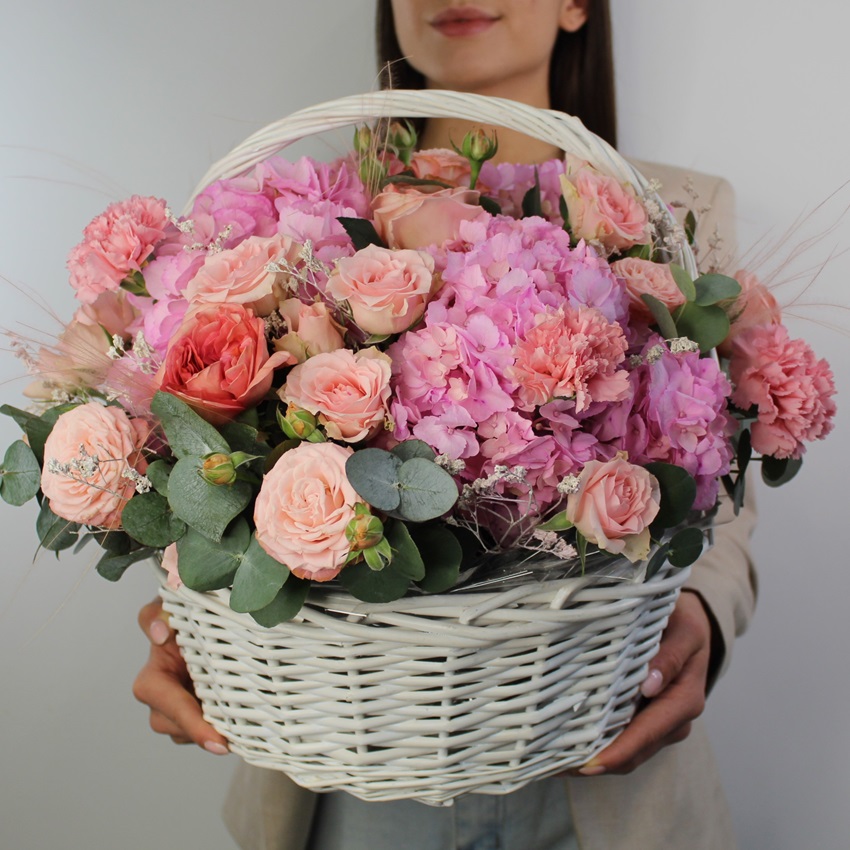Гортензия и пионовидные розы в корзине "Милашка"
