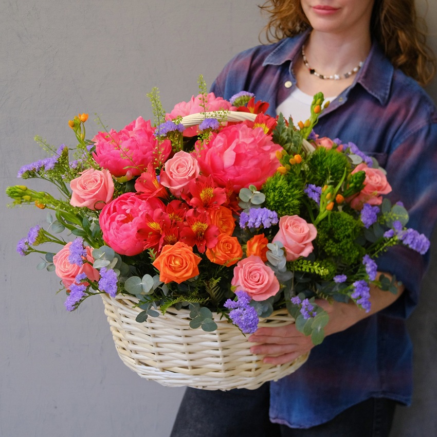 Коралловые пионы и кустовые розы в яркой корзине "Закат над океаном"