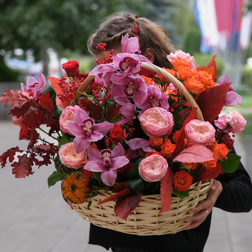 Осенний карнавал невероятных красок в нарядной композиции. В составе фантастическая, ароматная орхидея цимбидиум, пионовидные розы, декоративные тыковки кукурбита и сезонная зелень.