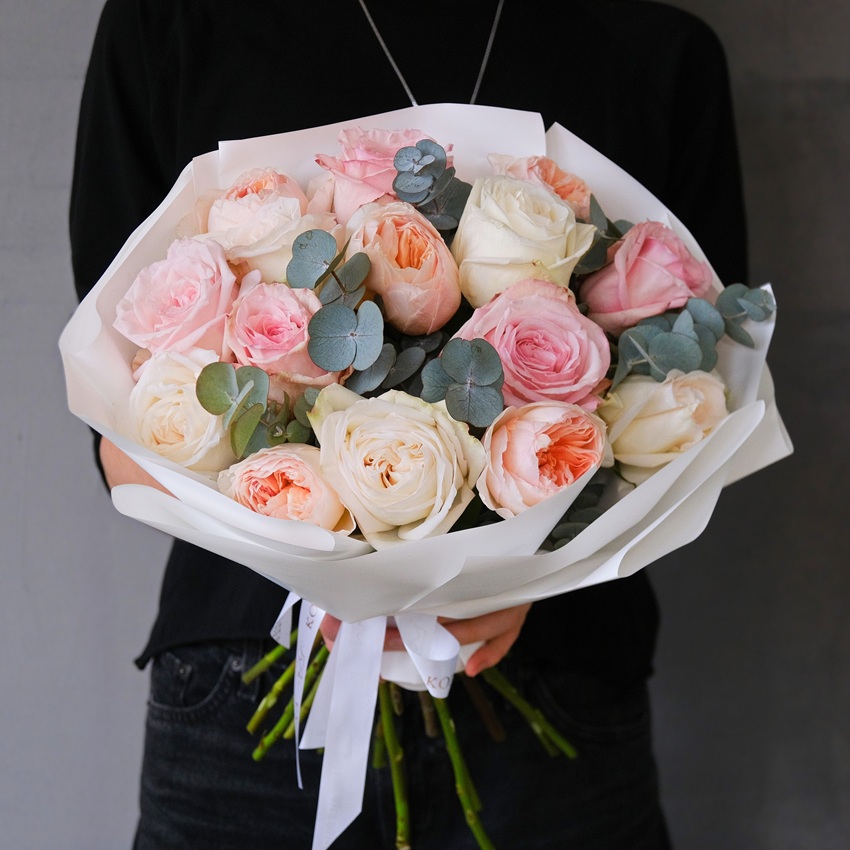 15 великолепных пионовидных роз Дэвида Остина раскрываются, словно акварельные зарисовки, демонстрируя идеальную форму и тонкий, пьянящий аромат.