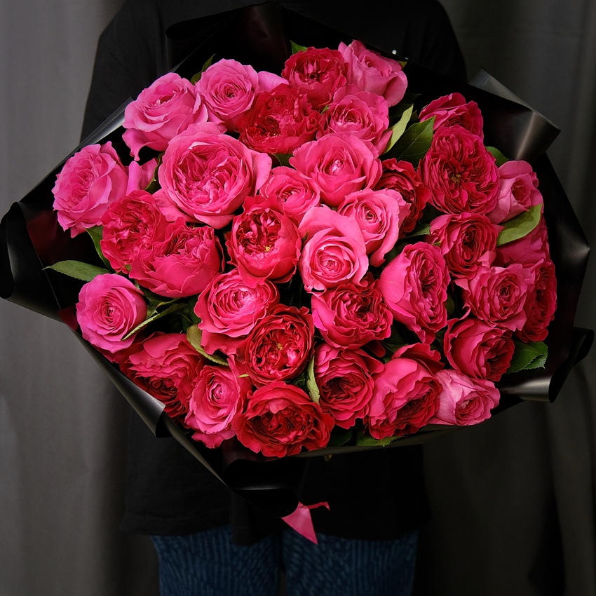 Эти премиальные розы узнаются с первого взгляда по своей уникальной, пионовидной форме, состоящей из множества бархатистых лепестков, образующих идеальную чашу.