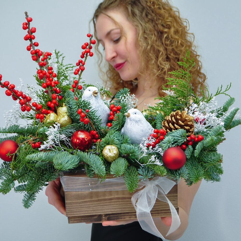 Сюжетная зимняя композиция из живой ароматной пихты с сувенирами - волшебными снежными птичками.