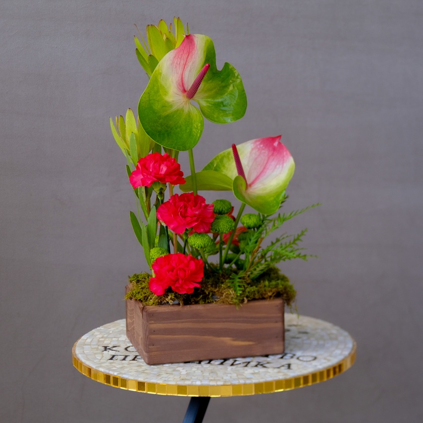 Антуриумы и гвоздики в интерьерной композиции в ящике