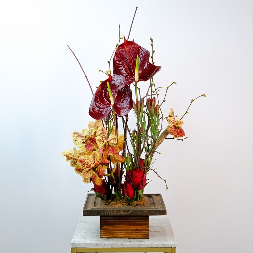 Интерьерная композиция с экзотическими цветами: королевская орхидея Ванда и антуриумы. Стильно, лаконично. Выполнена на заказ. Повтор возможен в другом, индивидуально подобранном кашпо.