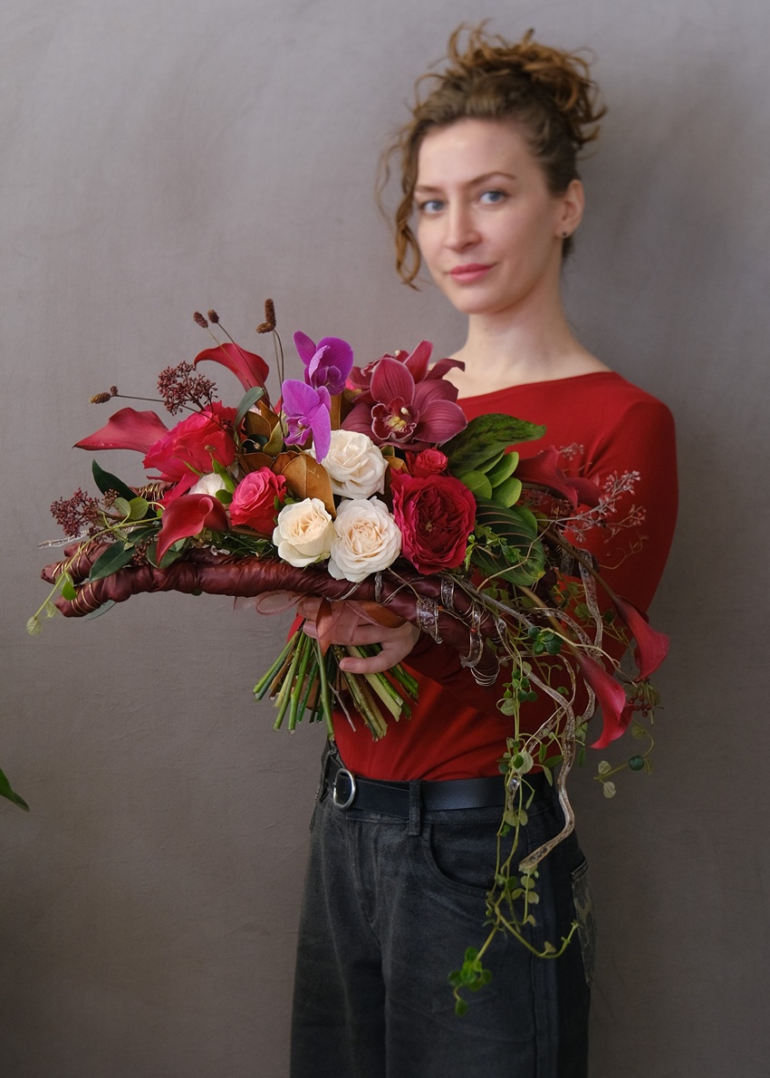 Необыкновенной красоты креативный букет на каркасе ручной работы. Страстный цвет и нетривиальный подбор материала: в составе каллы, орхидеи и изящная зелень.