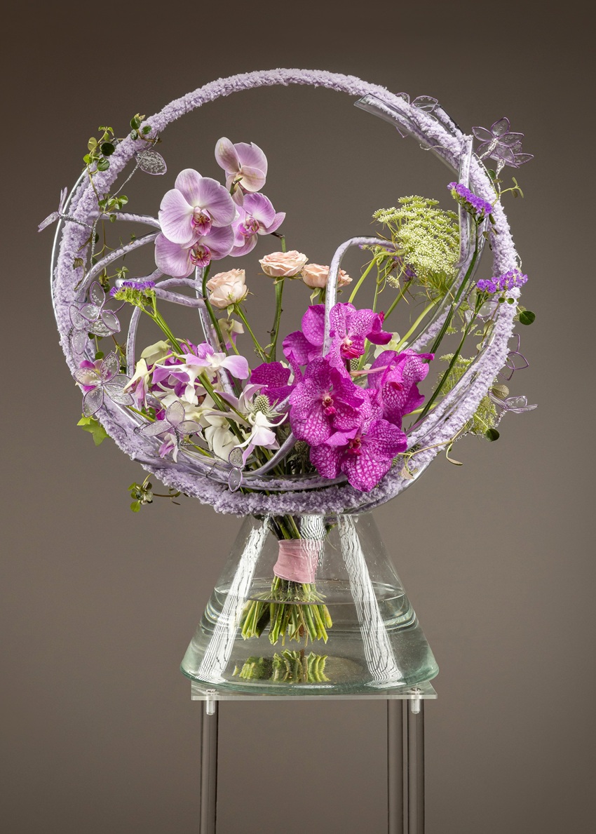 Креативный букет на каркасе ручной работы с необыкновенным составом: орхидеи и причудливая зелень.