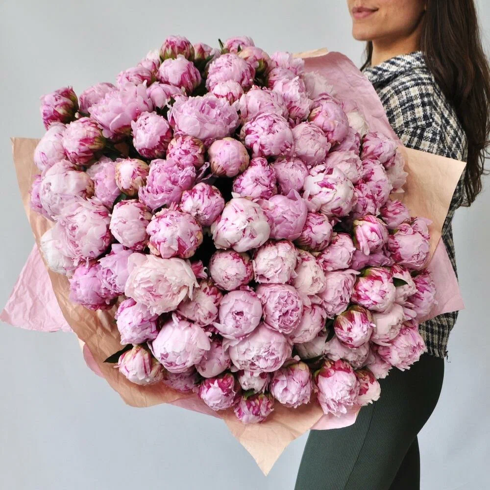 Монобукет Сара Бернар от Королевства Праздника - это огромный букет из 101 ароматного розового пиона сорта Сара Бернар.