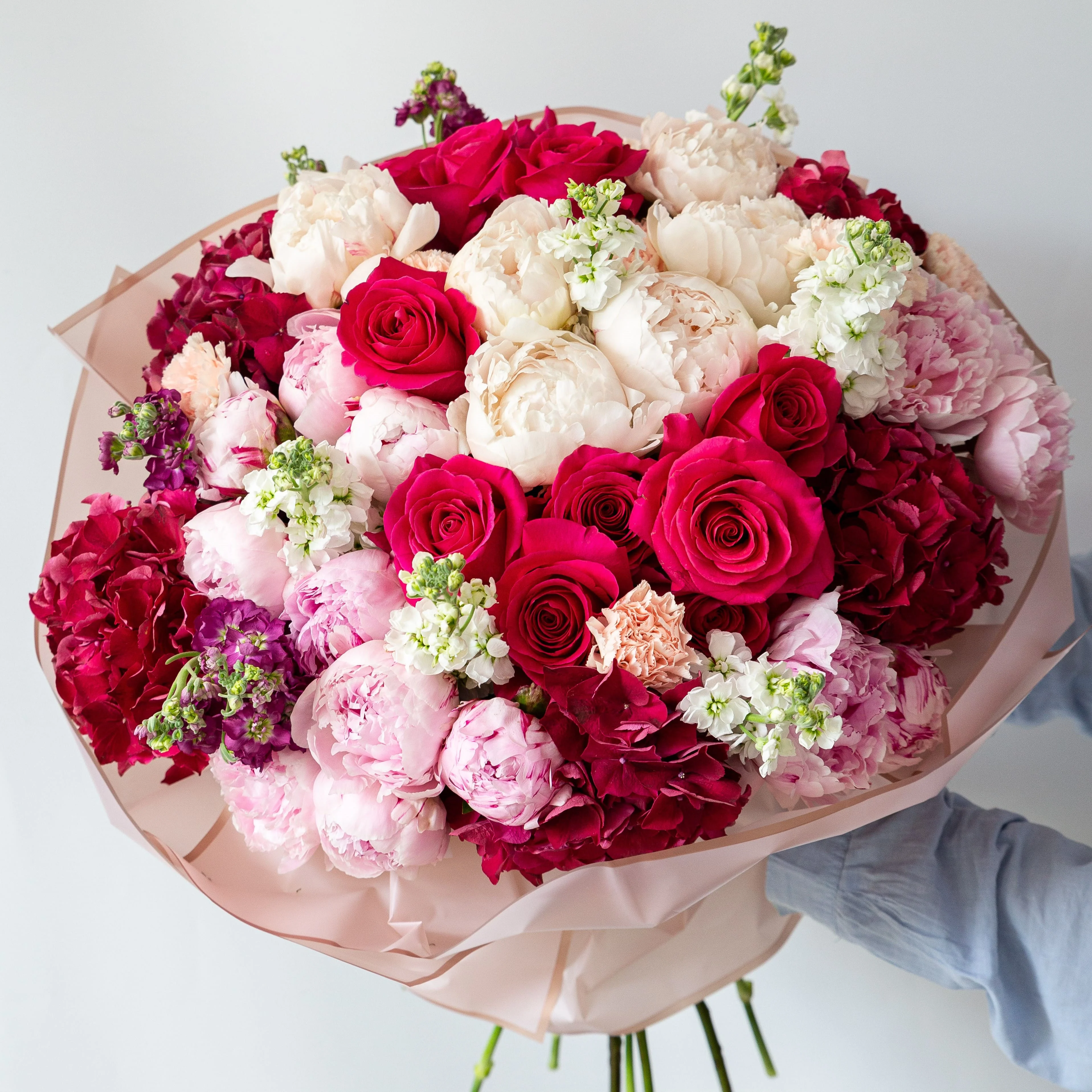 Букет Обнимаю нежно - это сочетание потрясающих оттенков нежности, которые подарят вам незабываемые эмоции и радость. В составе букета вы найдете пионы, гортензию, ароматные маттиолы и пионовидные розы, которые создадут атмосферу любви и единения.