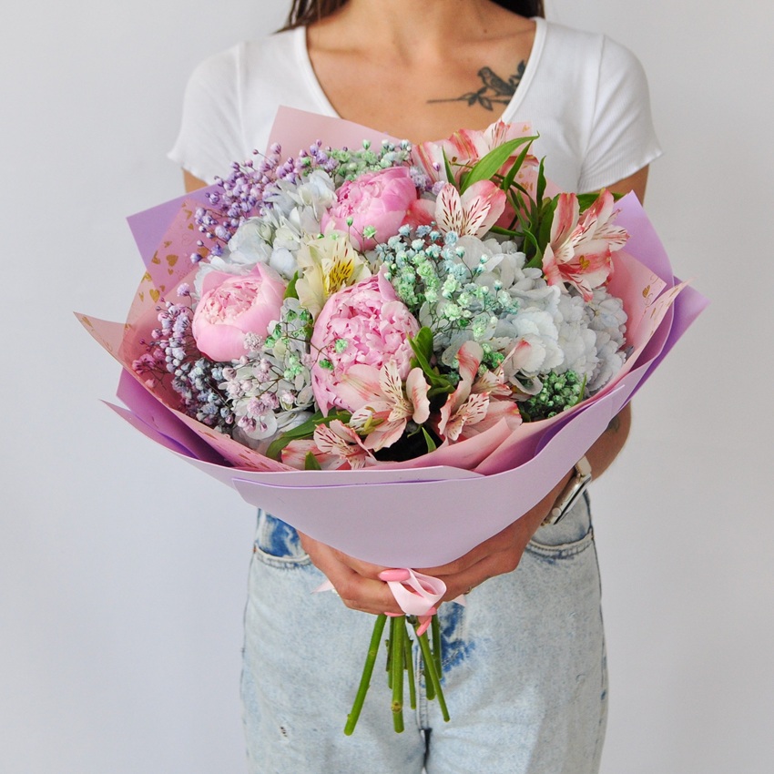 По-летнему яркий и ароматный букет с сезонными цветами: гортензия и пушистые, розовые пионы.