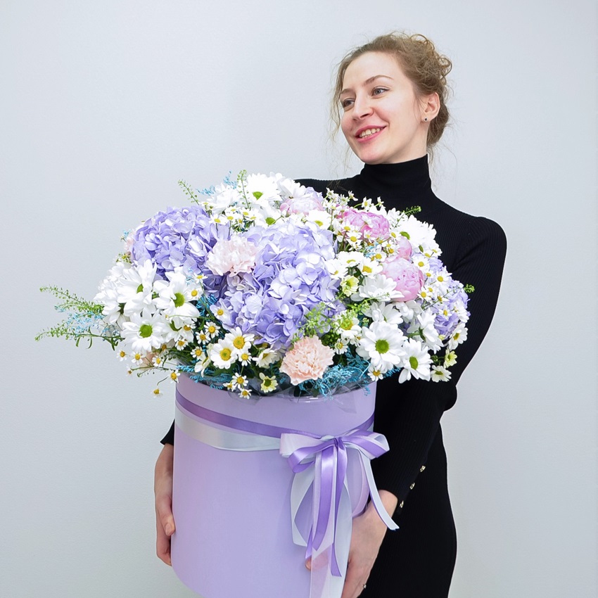 Гортензия, ромашки и пионы в коробке "Русская роскошь"