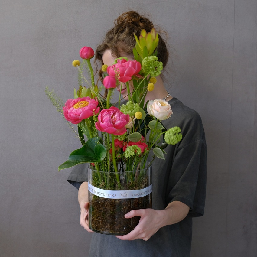 Коралловые пионы в интерьерном букете в вазе "Малиновый кот в стеклянном саду"
