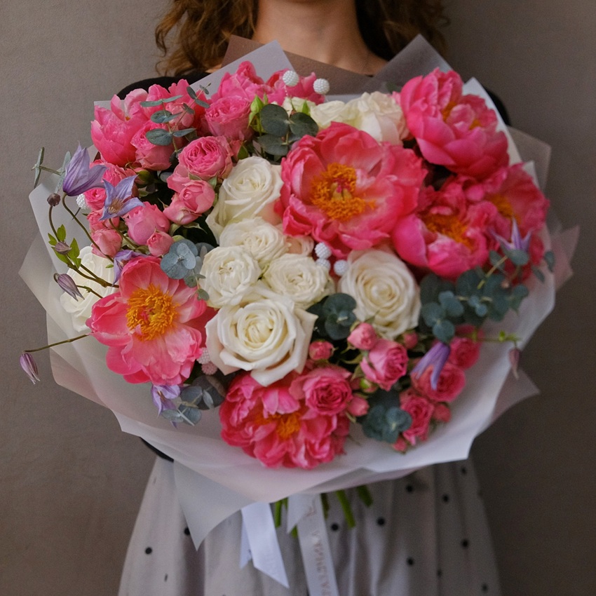 Коралловые пионы и белые розы в букете "Коралловая сказка"